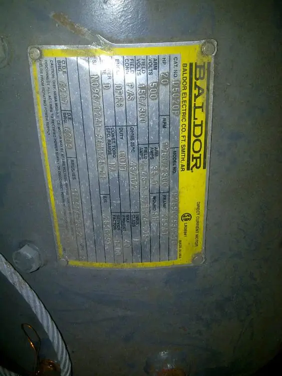 BALDOR 20hp DC motor with 1750/2300 rpm and 150/300v specifications, ideal for extrusion applications. Used but in good working condition. Model: dc motor. Quantity: 1.