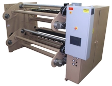 84" Filmaster Dual Turret Winder, refurbished with new electricals, AC Vector drive motors, and controls. Features upgraded switches, pneumatic lines, regulators, and gauges. Equipped with high-speed and idler bearings for optimal performance.