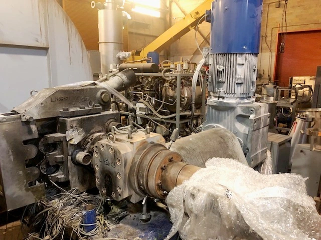 Used MAAG 40 HP 90/90 melt pump on support stand, approx. 58" centerline height. Previously on an 8" extruder, OPS BiAx cast film line. Comes with spare motor and gearbox.