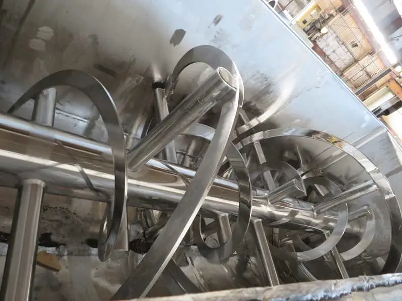 Used 250 cubic foot stainless steel non-jacketed stainless steel double ribbon blender. Chain driven by 460 volt, 75 HP motor, with center bottom outlet. Trough is 60" wide x 66" deep x 144" long. Blender is mounted on stainless steel legs. Serial #64750-G3.