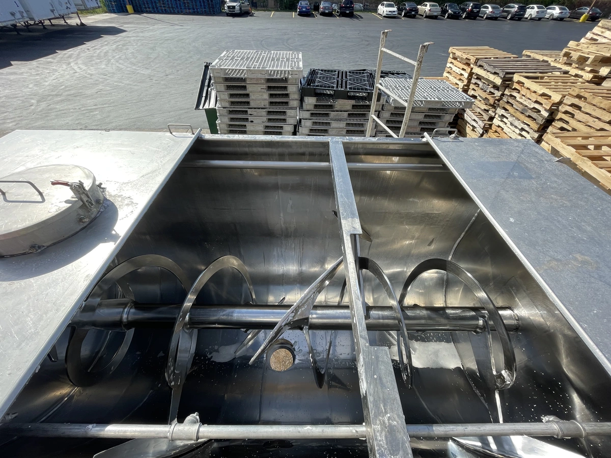 2001 Eirich PRB-190 Ribbon Blender available for resin handling. Features a 152 cubic ft working volume, 60 hp motor, and outer paddle inner ribbon design, ideal for mixing laundry powder. Serial #5717.