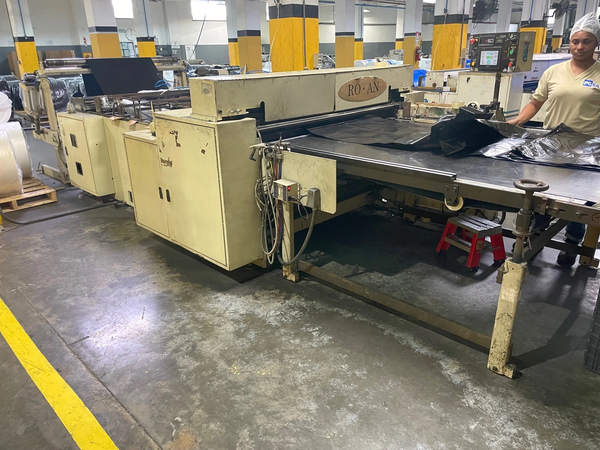 Ro-An 56" Bottom Seal Bag Machine, Model PSB 9056 SOLID, 2007. Features include flying knife cut-off, 60" max bag length, impulse sealing, and 3 cross bank ventilation perforators. Power: 230-3-60. Used condition, priced to move.