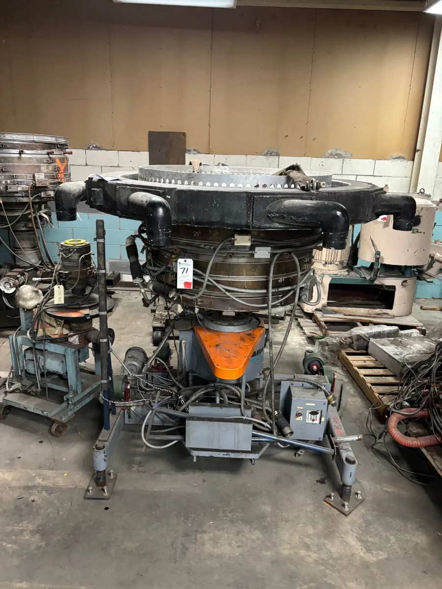 Gloucester Engineering Co 34" monolayer blown film die, used condition. Includes cart, rotator (2" bore), and 2019 Techflow dual lip air ring. Note: missing gear motor, .080 die gap, and not drilled for IBC.