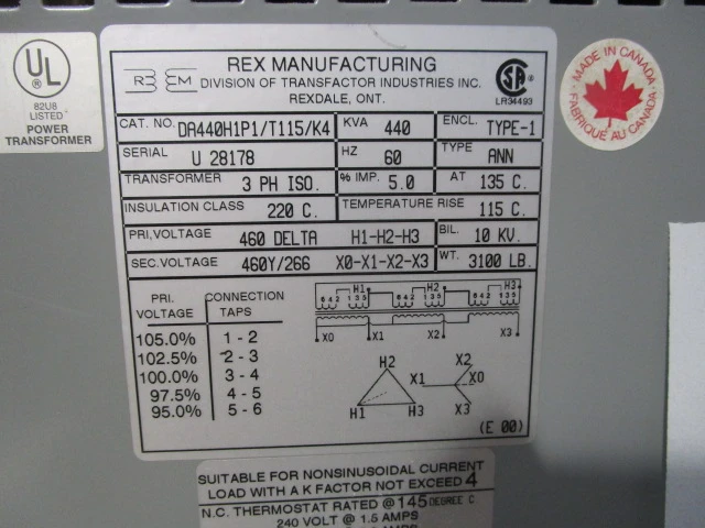 REX MANUFACTURING 440 kVA isolation transformer available. 2000 model, 3-phase, converts 460 delta to 460/266 Y.