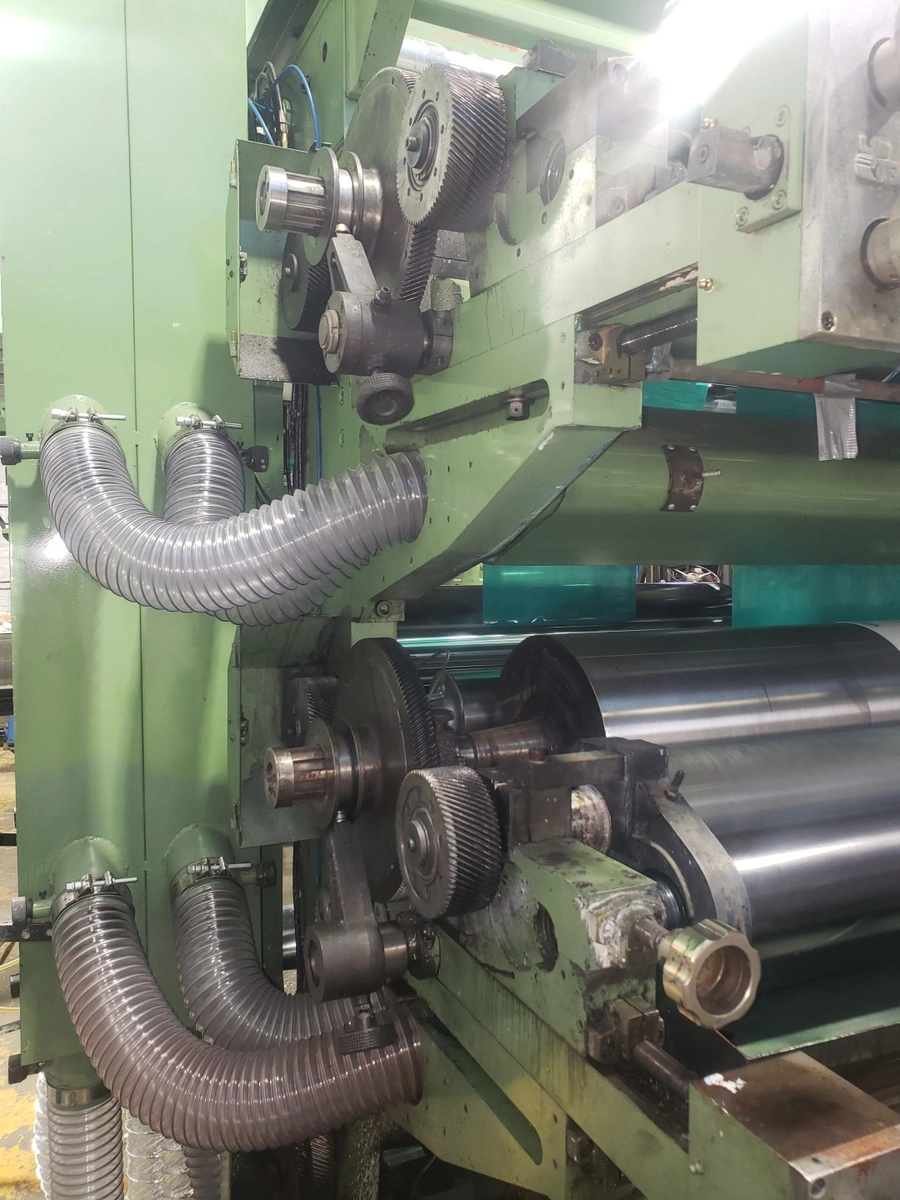 1993 UTECO Gold RR608 printing press, 6-color stack, 58.25" max web width, 57.5" print width. Comes with numerous cylinders, 42" print repeat, 7 anilox rolls, 2004 Micro Clean 120D. Speed: 400'/min, 3-stage electric drying. rewind has been removed.