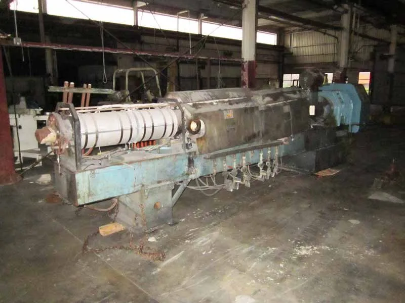 Gloucester Engineering Co 6" 30:1 used extruder, vented barrel, electrically heated, water-cooled. Includes 6 zone barrel with screw and clamp. Some parts missing: no motor, no control panel.