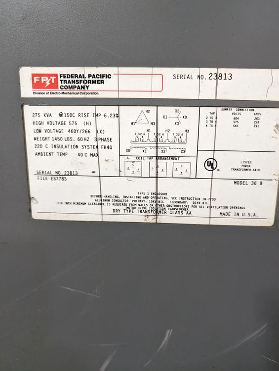 Federal Pacific Transformer Company 275 kva transformer 460v - 575v