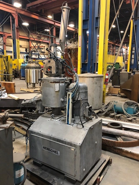 For sale: 1995 Henschel FM 40D resin handling high-intensity mixer. Features 40-liter capacity, 2-speed motor, air cylinder discharge valve, and deflector blade. No motor starter or controls. Perfect for industrial blending needs. Serial #04448.