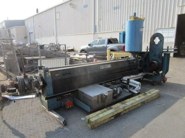 Used Davis Standard 4.5" 30:1 low boy extruder available. Features water cooling, DC drive (motor missing), temperature control panel, and manual screen changer.