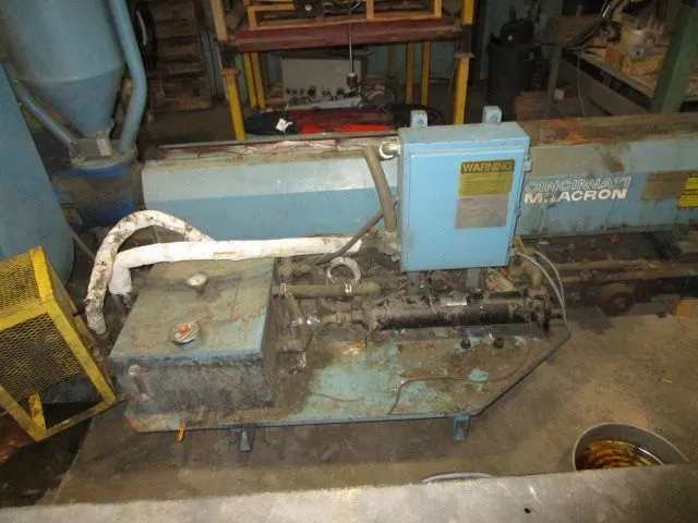 CINCINNATI MILACRON 3.5" extruder, used. Features a 30:1 water-cooled system, 150 hp DC motor. Includes screen changer. Equipped with a Flenders gearbox with an 18.7:1 ratio.