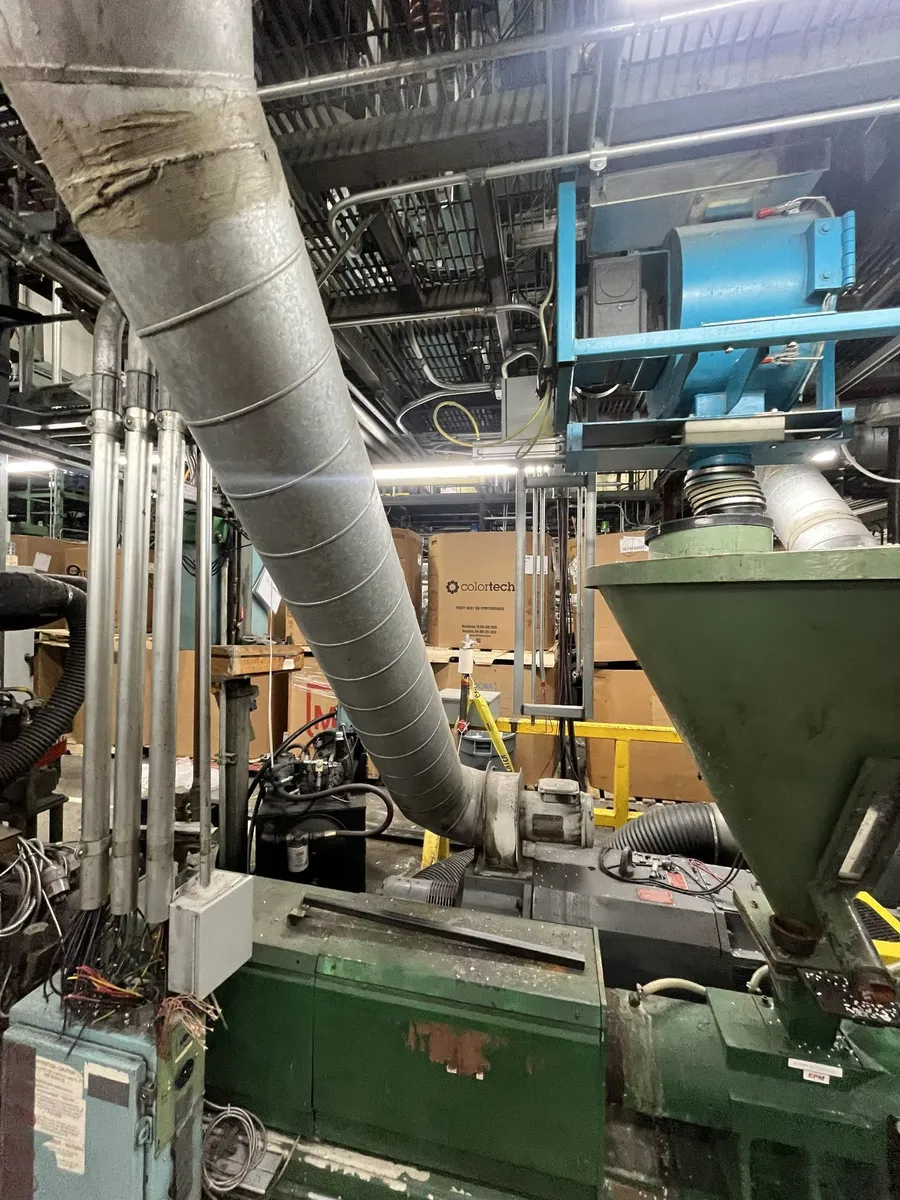 Gloucester Contracool 80mm HG 30:1 extruder with helical groove feed throat, 200 hp AC motor, 13.86:1 gear box ratio, drive, hopper, and hydraulic screen changer. Buyer to remove.