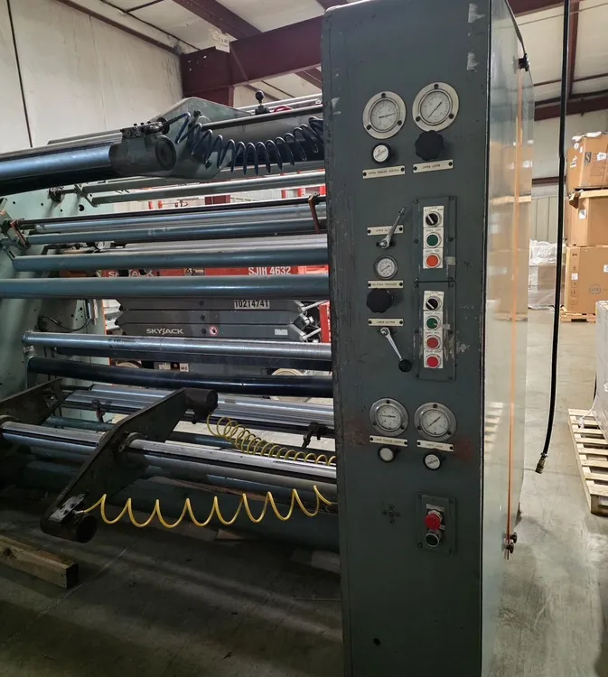 Gloenco 124 dual turret winder, 1983 model. Features 84" width, includes infeed nip, 4 x 3" air shafts.