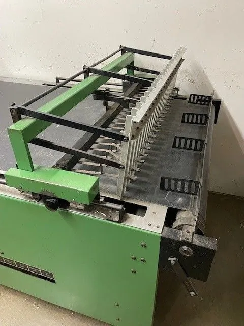 56" Ro-An stacking table (index conveyor pneumatic operation, adj clamping fingers, 5" min 20" max draw length).